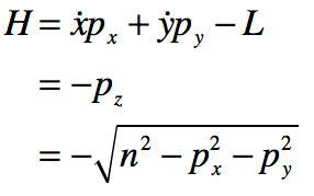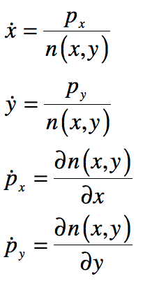 If the optical rays are restricted to the x-y plane, then Hamilton’s equations of motion can be expressed relative to the path length ds, and the momenta are pa = ndxa/ds. The ray equations are (simply expressing the 2 second-order Eikonal equation as 4 first-order equations)