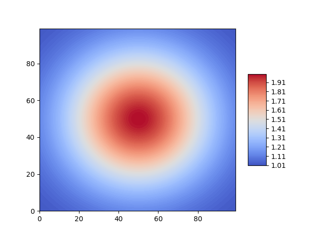 contr = plt.contourf(V,100, cmap=cm.coolwarm, vmin = 1, vmax = 3)