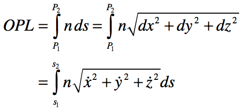 The OPL between two points in a refractive medium is the sum of the piecewise product of the refractive index n with infinitesimal elements of the path length ds. In integral form, this is expressed as