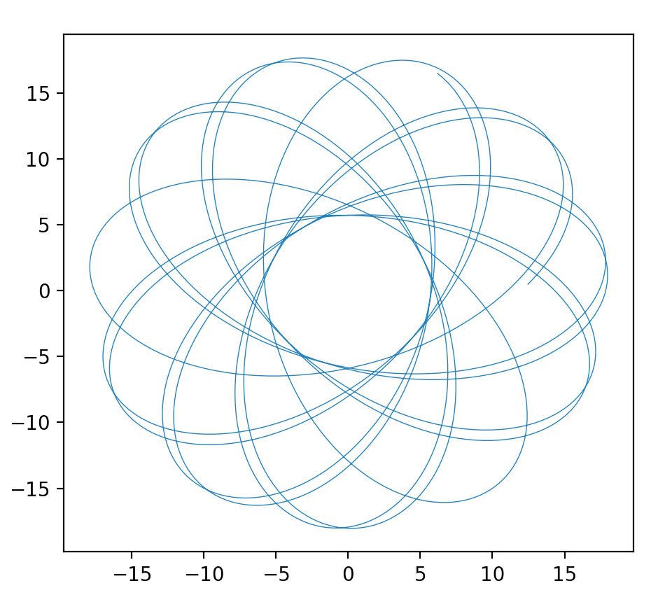 where r is the radius on the x-y plane. Putting this refractive index profile into the Eikonal equations creates a two-dimensional orbit in the x-y plane. The Eikonal Equation is the “F = ma” of ray optics. It’s solutions describe the paths of light rays through complicated media, including the phenomenon of gravitational lensing (see my blog post) and the orbits of photons around black holes (see my other blog post).
