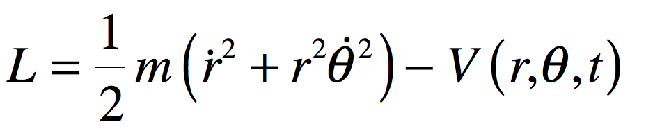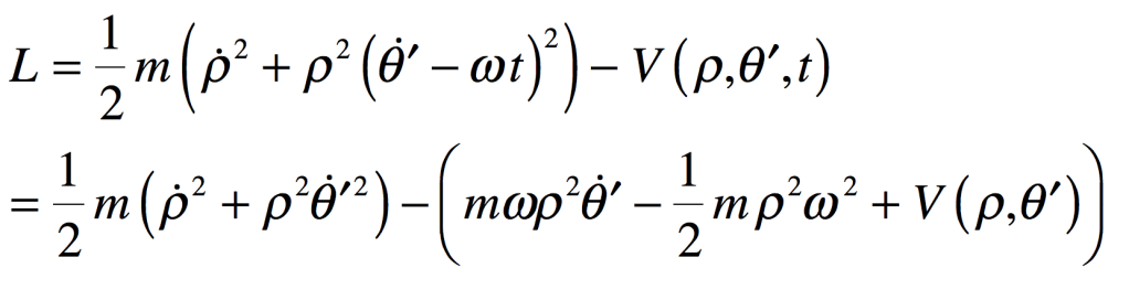 where the potential is time dependent because of the motion of the two larger masses. Lagrange approached the problem by adopting a rotating reference frame in which the two larger masses m1 and m2 move along the stationary line defined by their centers. The new angle variable is theta-prime. The Lagrangian in the rotating frame is