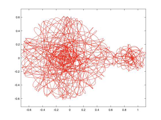 A single trajectory solved for this flow is shown in Fig. 1 for a tiny object passing back and forth chaotically between the Earth and the Moon. The object is considered to be massless, or at least so small it does not perturb the Earth-Moon system. The energy of the object was selected to allow it to pass over the potential barrier of the Lagrange-Point L1 between the Earth and the Moon. The object spends most of its time around the Earth, but now and then will get into a transfer orbit that brings it around the Moon. This would have been the fate of Apollo 11 if their last thruster burn had failed.