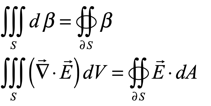 Maybe the most famous application of these theorems is to convert Maxwell’s equations of electromagnetism from their differential form to their integral form.  For instance, we can start with the differential version for the curl of the B-field and integrate over a surface
