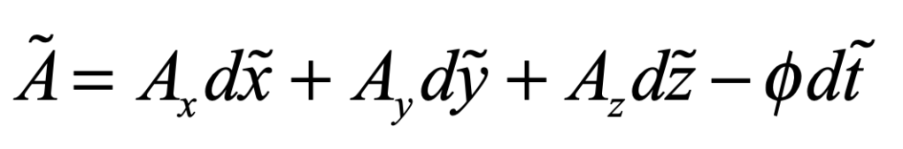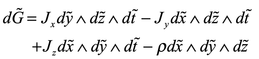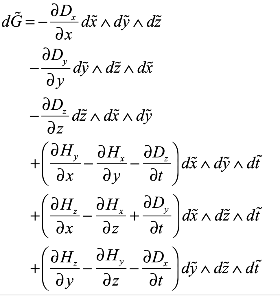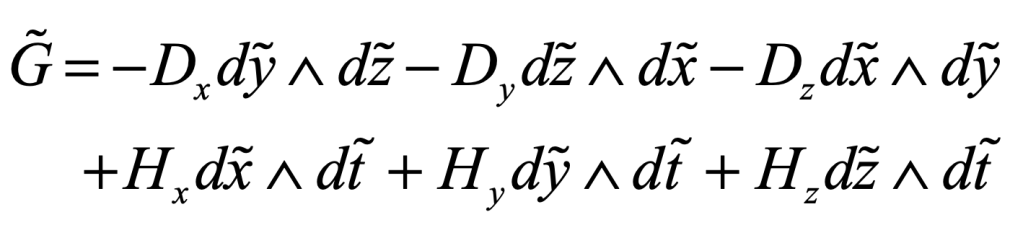 As long as we are working with differential forms and Stokes’ Theorem, let’s finish up by looking at Maxwell’s electromagnetic equations as four-dimensional equations in spacetime.  First, construct the 2-form using the displacement field D and the magnetic intensity H.