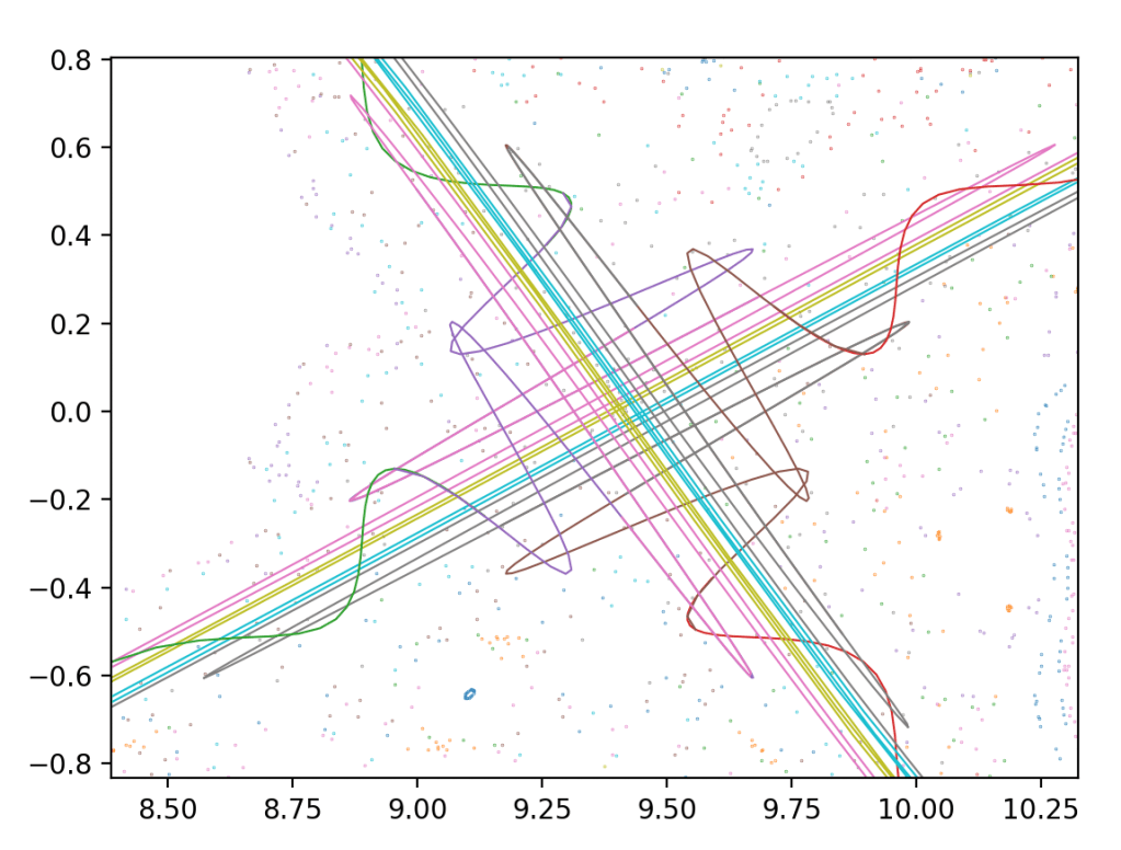 The four traces all intertwine at the saddle point in the figure below with a zoom in on the tangle in the next figure. This is the lattice work that Poincaré glimpsed in 1889 as he worked feverishly to correct the manuscript that won him the prize that established him as one of the preeminent mathematicians of Europe.