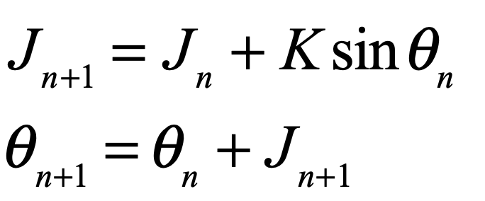 The restricted 3-body problem is a bit more complicated than is needed to illustrate Poincaré’s homoclinic tangle. A much simpler model is a discrete map called Chirikov’s Map or the Standard Map. It describes the Poincaré section of a periodically kicked oscillator that rotates or oscillates in the angular direction with an angular momentm J. The map has the simple form