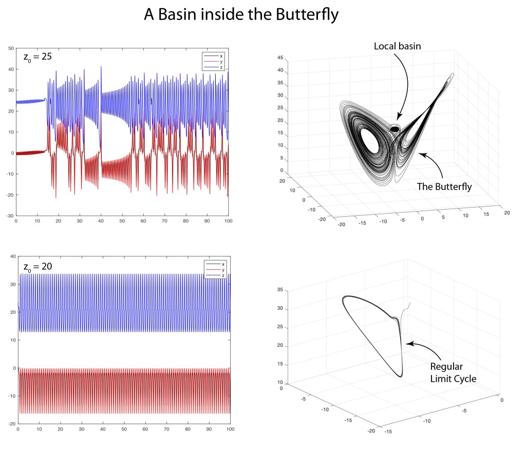 and r0 is the radius of the basin. The center of the basin is at [x0, y0, z0] and we are assuming that x0 = 0 and y0 = 0 and z0 = 25 for the standard Butterfly parameters p = 10, r = 25 and b = 8/3. This puts our basin of attraction a little on the high side of the center of the Butterfly. If we embed it too far inside the Butterfly it does actually destroy the Butterfly dynamics.