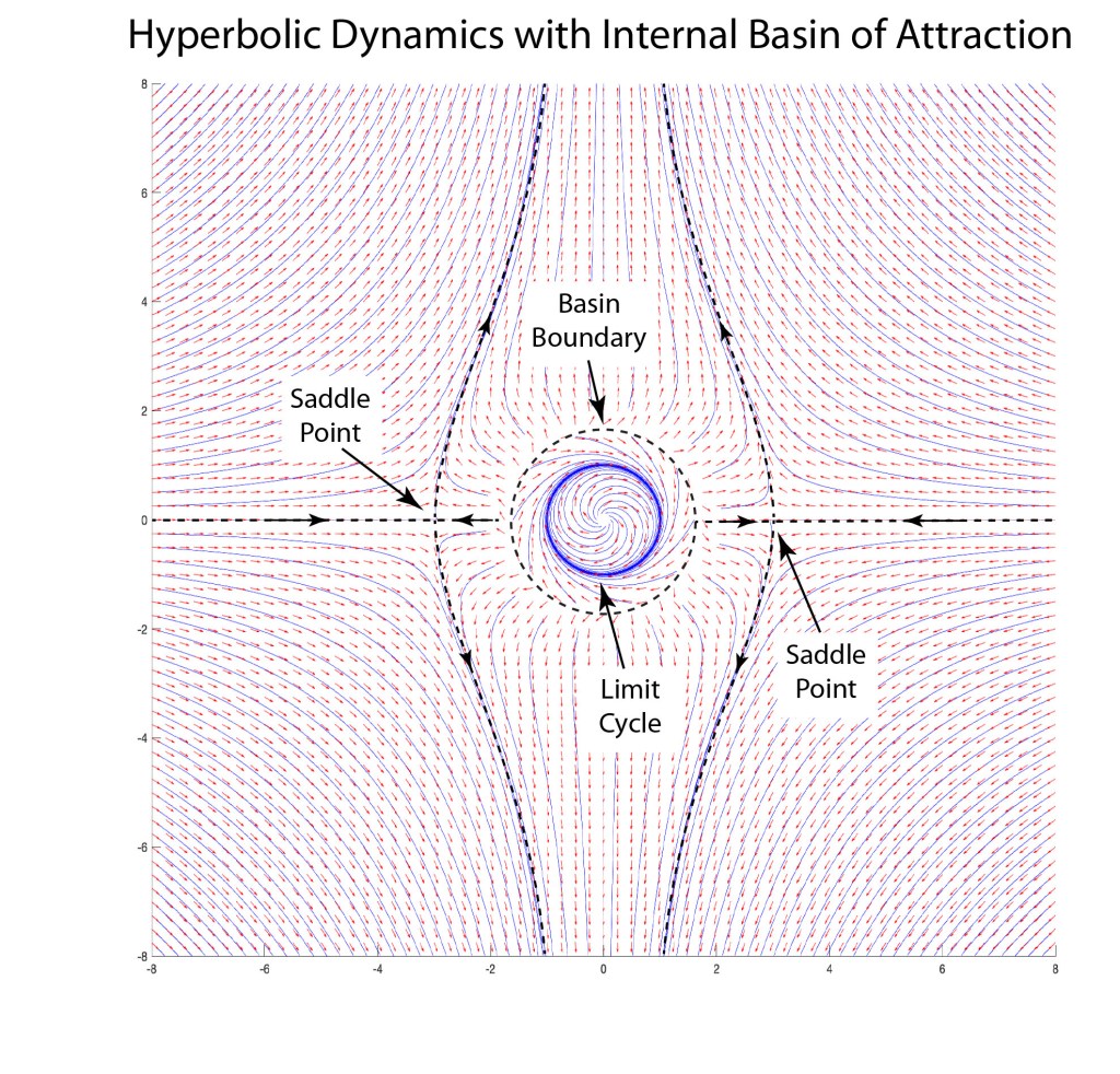 Adding the internal dynamics does not change the far-field external dynamics, which are still hyperbolic. The repulsive term does split the central saddle point into two saddle points, one on each side left-and-right, so the repulsive term actually splits the dynamics. But the internal dynamics are self-contained and separate from the external dynamics. The origin is an unstable spiral that evolves to a limit cycle. The basin boundary has marginal stability and is known as a “wall”.