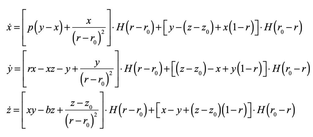 When r0 = 0, the dynamics of the Lorenz’ Butterfly are essentially unchanged. However, when r0 = 1.5, then there is a repulsive effect on trajectories that pass close to the basin. It can be seen as part of the trajectory skips around the outside of the basin in Figure 2.