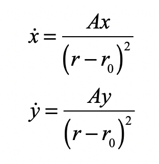 that has a single saddle fixed point at the origin. We want to add a basin of attraction at the origin with a domain range given by a radius r0. At the same time, we want to create a separatrix that keeps the outer hyperbolic dynamics separate from the internal basin dynamics. To keep all outer trajectories in the outer domain, we can build a dynamical barrier to prevent the trajectories from crossing the separatrix. This can be accomplished by adding a radial repulsive term