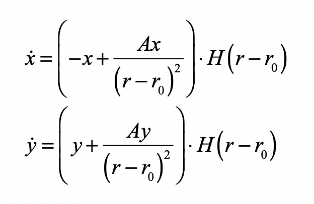 We also want to keep the internal dynamics of our basin separate from the external dynamics. To do this, we can multiply by a sigmoid function, like a Heaviside function H(r-r0), to zero-out the external dynamics inside our basin. The final external dynamics is then