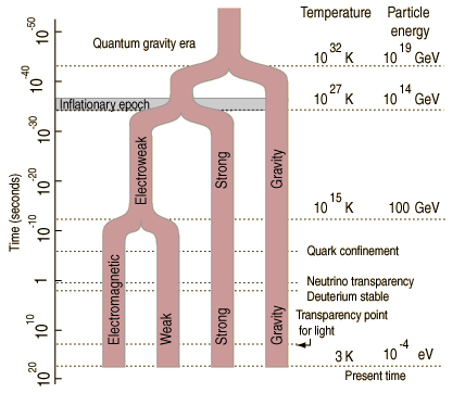 The early universe was extremely hot and energetic, so much so that all the forces of nature acted as one–described by a unified Lagrangian (as yet resisting discovery by theoretical physicists) of the highest symmetry. Yet as the universe expanded and cooled, the symmetry of the Lagrangian broke, and the unified forces split into two (gravity and electro-nuclear). As the universe cooled further, the Lagrangian (of the Standard Model) lost more symmetry as the electro-nuclear split into the strong nuclear force and the electro-weak force. Finally, at a tiny fraction of a second after the Big Bang, the universe cooled enough that the unified electro-week force broke into the electromagnetic force and the weak nuclear force. At each stage, spontaneous symmetry breaking occurred, and invariants of physics were broken, splitting into new behavior. In 2008, Yoichiro Nambu received the Nobel Prize in physics for his model of spontaneous symmetry breaking in subatomic physics.