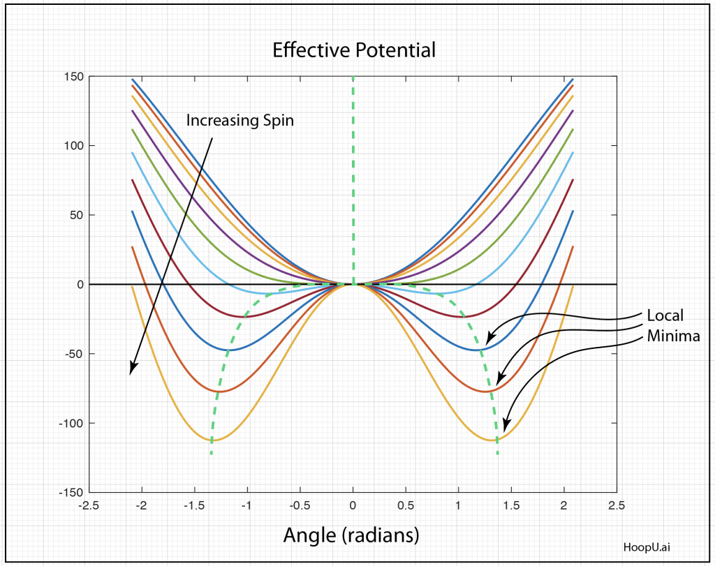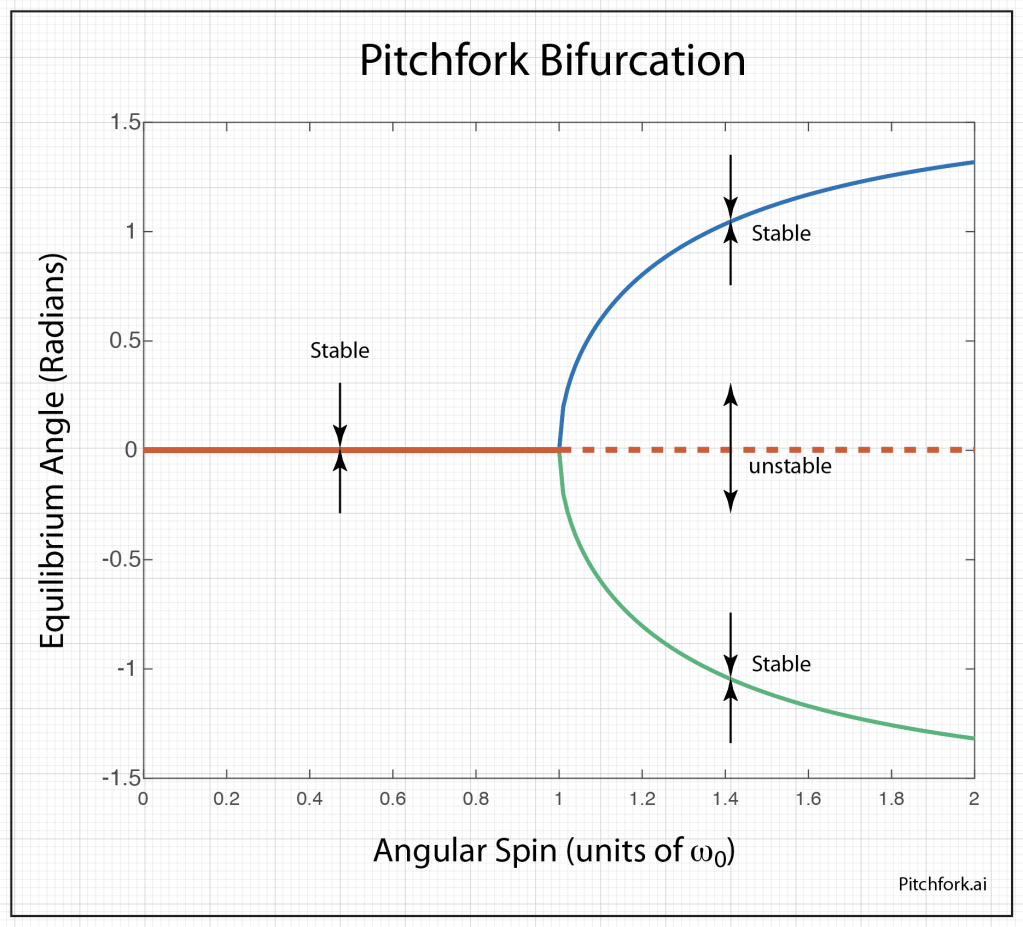 This is an example of a dynamical phase transition that leads to spontaneous symmetry breaking and a pitchfork bifurcation. By integrating the angular acceleration we can get the effective potential for the problem. One contribution to the potential is due to gravity. The other is centrifugal force. When combined and plotted in Fig. 4 for a family of values of the spin rate ω, a pitchfork emerges naturally by tracing the minima in the effective potential. The values of the new equilibrium angles are given in Fig. 2.