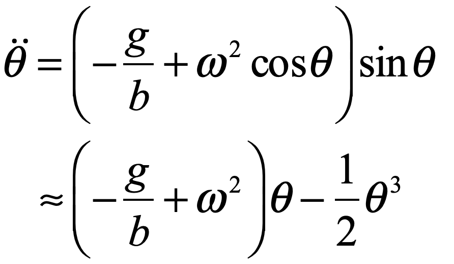 One of the simplest mechanical models that displays spontaneous symmetry breaking and the pitchfork bifurcation is a bead sliding without friction on a circular hoop that is spinning on the vertical axis, as in Fig. 3. When it spins very slowly, this is just a simple pendulum with a stable equilibrium at the bottom, and it oscillates with a natural oscillation frequency ω0 = sqrt(g/b), where b is the radius of the hoop and g is the acceleration due to gravity. On the other hand, when it spins very fast, then the bead is flung to to one side or the other by centrifugal force. The bead then oscillates around one of the two new stable fixed points, but the fixed point at the bottom of the hoop is very unstable, because any deviation to one side or the other will cause the centrifugal force to kick in. (Note that in the body frame, centrifugal force is a non-inertial force that arises in the non-inertial coordinate frame. )