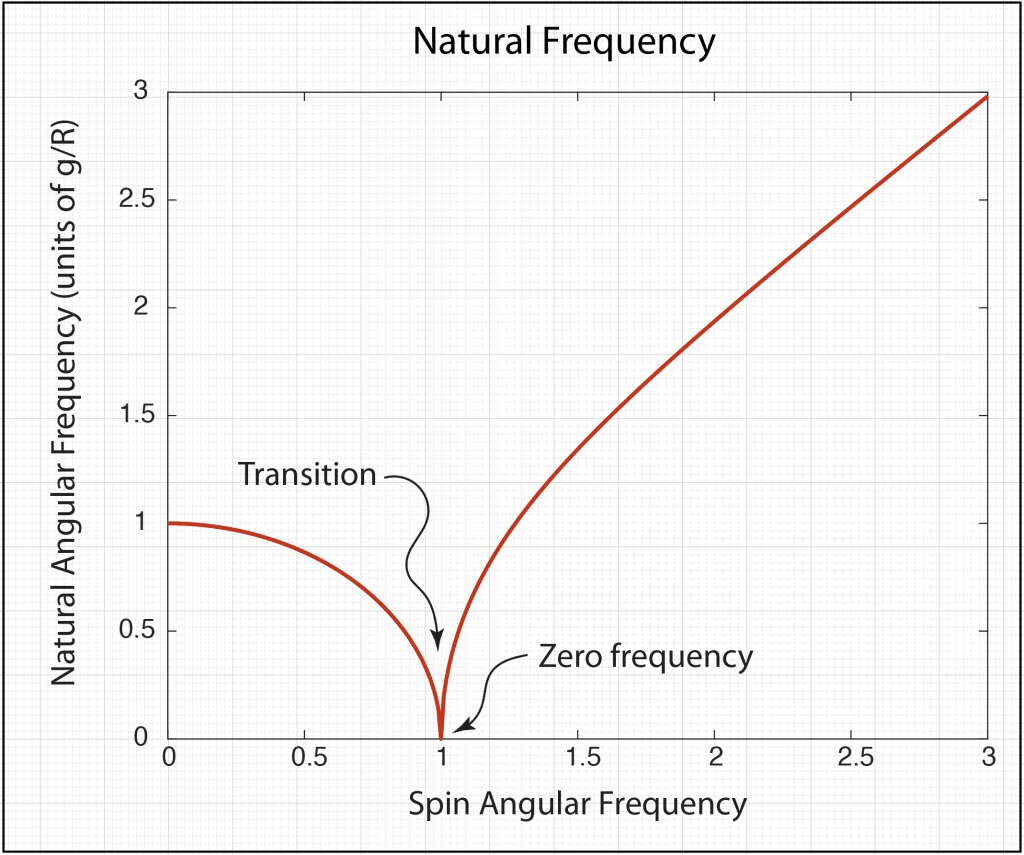 Note that this is zero frequency at the transition threshold, then rises to match the spin rate of the hoop at high frequency. The natural oscillation frequency as a function of the spin looks like Fig. 5.