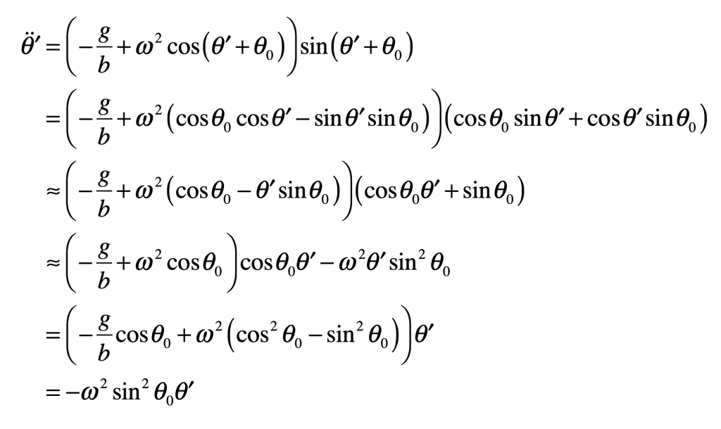 As the effective potential gets flatter, the natural oscillation frequency decreases until it vanishes at the transition spin frequency. As the hoop spins even faster, the new equilibrium positions emerge. To find the natural frequency of the new equilibria, expand θ around the new equilibrium θ’ = θ – θ0