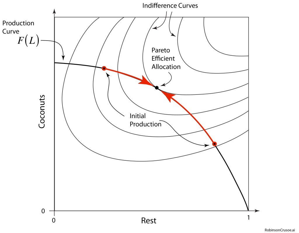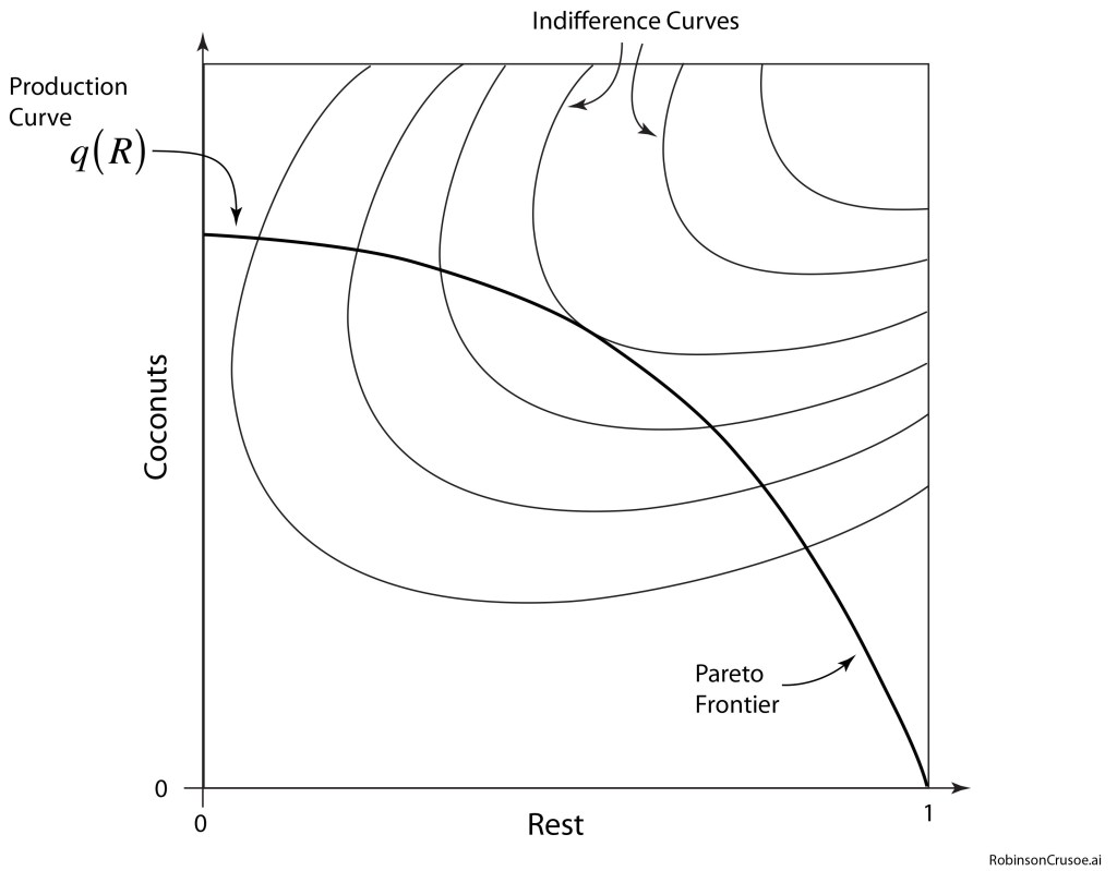 The production curve presents a continuous trade-off between consumption and leisure, but at first look there is no obvious way to decide how much to work and how much to rest. A lazy person might be willing to go a little hungry if they can have more rest, while a busy person might want to use all waking hours to find coconuts. The production curve represents something known as a Pareto frontier. It is a continuous trade-off between two qualities. Another example of a Pareto frontier is car engine efficiency versus cost. Some consumers may care more about the up-front cost of the car than the cost of gas, while other consumers may value fuel efficiency and be willing to pay higher costs to get it.