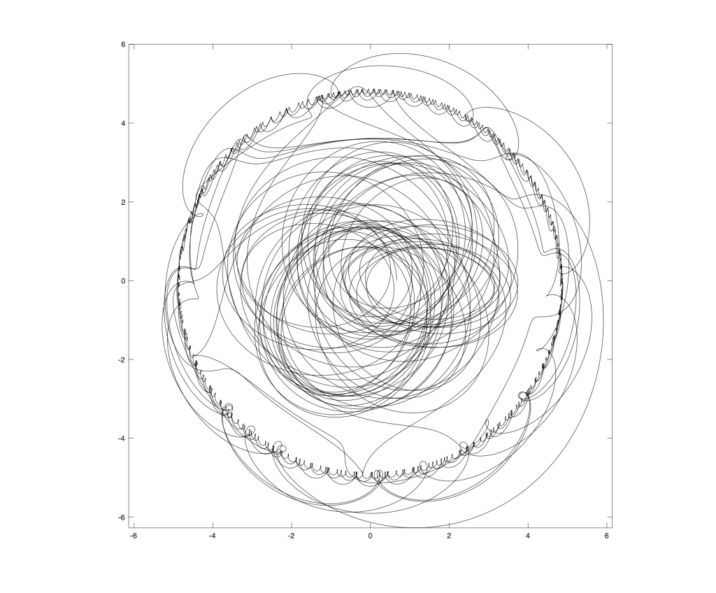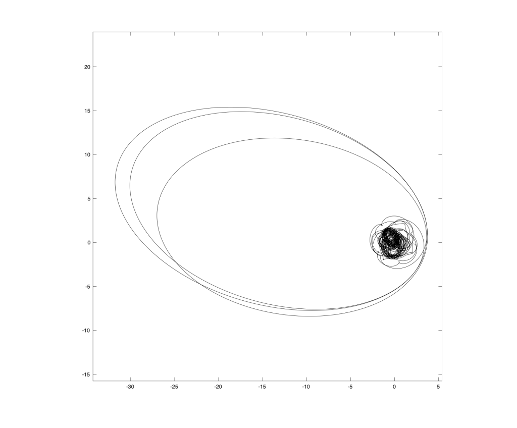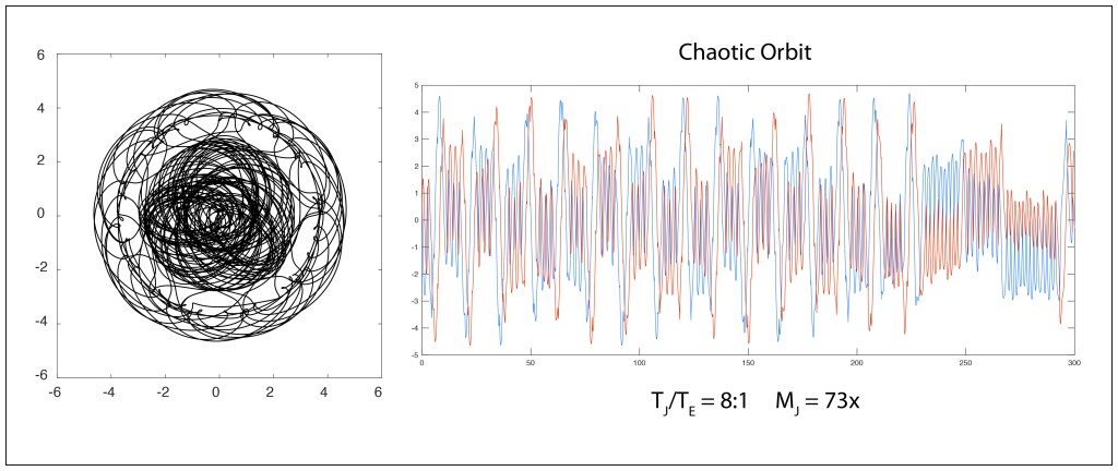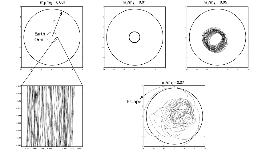 If Nemesis were to swing by and scramble the solar system, then Jupiter might move closer to the Earth. More ominously, the period of Jupiter’s orbit could come into resonance with the Earth’s period. This occurs when the ratio of orbital periods is a ratio of small integers. Resonance can amplify small perturbations, so perhaps Jupiter would become a danger to Earth. However, the forces exerted by Jupiter on the Earth changes the Earth’s orbit and hence its period, preventing strict resonance to occur, and the Earth is not ejected from the solar system even for initial rational periods or larger planet mass. This is related to the famous KAM theory of resonances by Kolmogorov, Arnold and Moser that tends to protect the Earth from the chaos of the solar system. More often than not in these scenarios, the Earth is either captured by the super Jupiter, or it is thrown into a large orbit that is still bound to the sun. Some examples are given in the following figures.