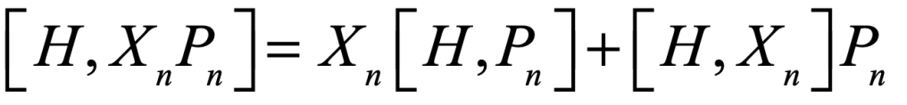 Begin with the commutator between the Hamiltonian H and the action composed as the product of the position operator and the momentum operator XnPn