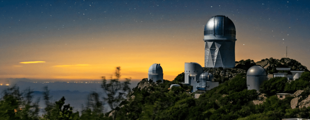 The Dark Energy Spectroscopic Instrument (DESI) on top of Kitt Peak in Arizona is measuring the distances to millions of galaxies using automated fiber optic arrays containing thousands of optical fibers. In one year it measured the distances to about 6 milliion galaxies.