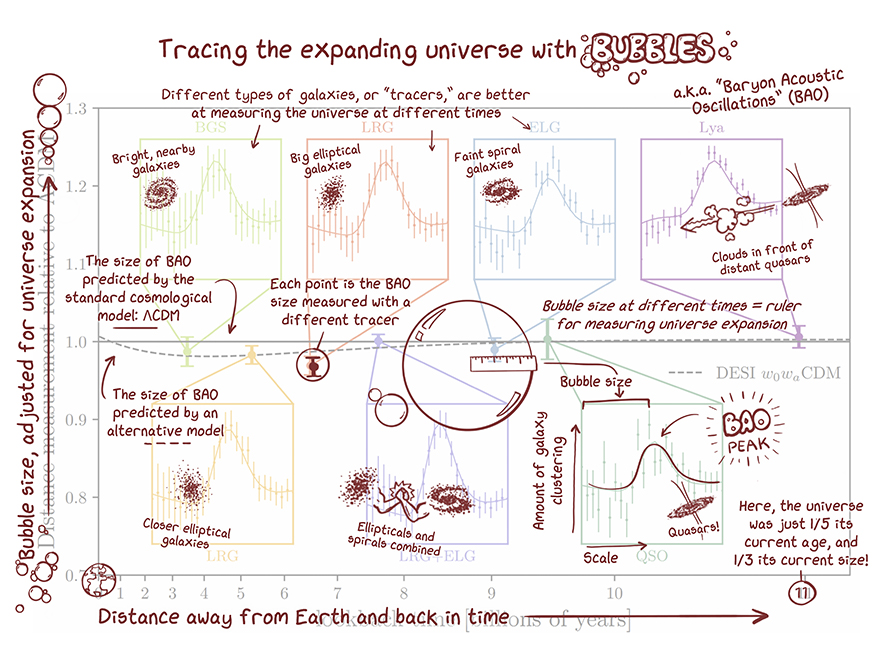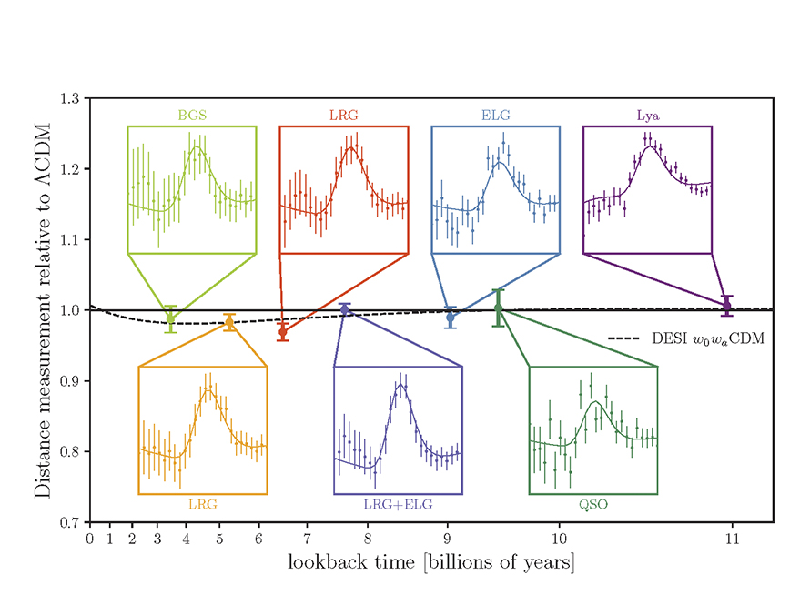 By focusing on seven “epochs” in galaxy formation in the universe, it measures the sizes of the BAO ripples over time, ranging in ages from 3 billion to 11 billion years ago. (The universe is about 13.8 billion years old.) The relative sizes are then compared to the predictions of the LCDM (Lambda-Cold-Dark-Matter) model. This is the “consensus” model of the day—agreed upon as being “most likely” to explain observations. If Dark Energy is a true constant, then the relative sizes of the ripples should all be the same, regardless of how far back in time we look.