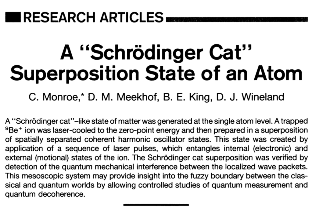 [2] C. Monroe et al. , A “Schrödinger Cat” Superposition State of an Atom. Science272,1131-1136(1996). DOI:10.1126/science.272.5265.1131