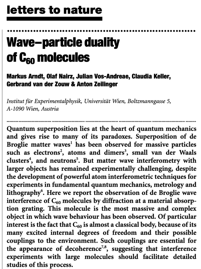 [3] Arndt, M., Nairz, O., Vos-Andreae, J. et al. Wave–particle duality of C60 molecules. Nature 401, 680–682 (1999). https://doi.org/10.1038/44348