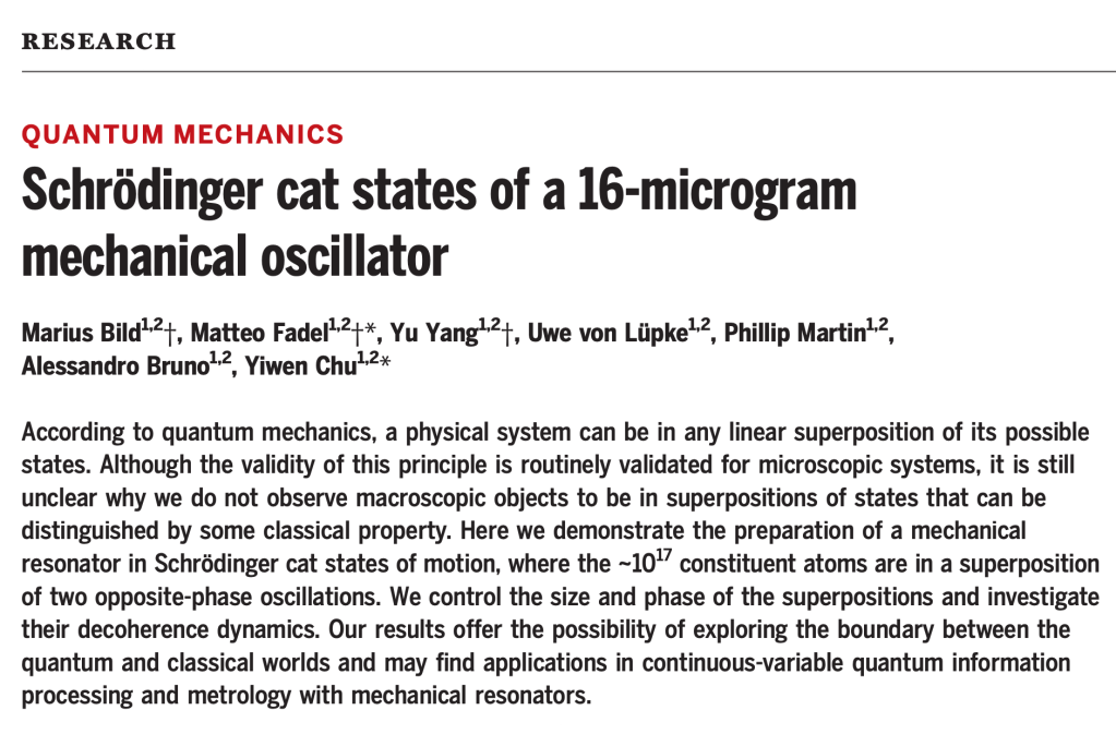 [4] Marius Bild et al., Schrödinger cat states of a 16-microgram mechanical oscillator. Science380, 274-278(2023). DOI:10.1126/science.adf7553