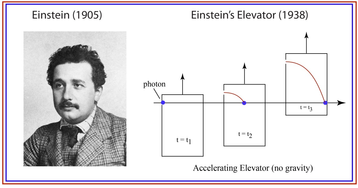 Here, in this obscure book that no-one remembers today, we find Einstein’s elevator for the first time, and the exposition talks very explicitly about a small window that lets in a light ray, and what the observer sees (in principle) for the path of the ray.