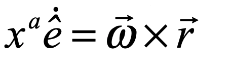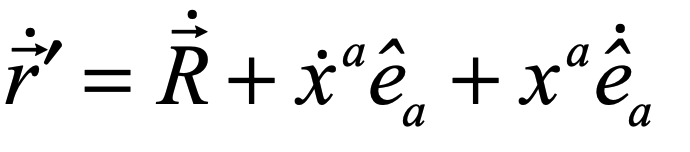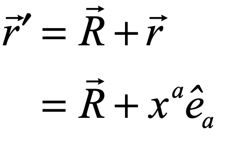 where R is the position vector of the origin of the rotating frame and r is the position in the rotating frame relative to the origin.  The funny notation on the last term is called in Physics-ese a “contraction”, but it is just a simple inner product, or dot product, between the components of the position vector and the basis vectors.  A basis vector is like the old-fashioned i, j, k of vector calculus indicating unit basis vectors pointing along the x, y and z axes.  The format with one index up and one down in the product means to do a summation.  This is known as the Einstein summation convention, so it’s just