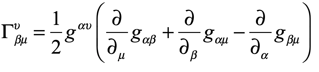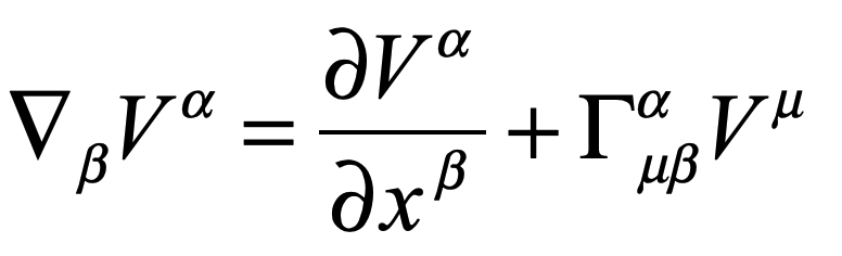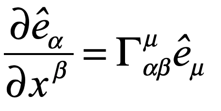 where the new “Gamma” symbol is called a Christoffel symbol.  It has lots of indexes, both up and down, which looks daunting, but it can be interpreted as the beta-th derivative of the alpha-th component of the mu-th basis vector.  The partial derivative is now