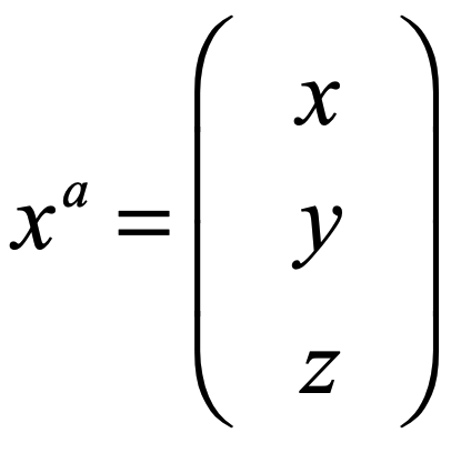 Now, as part of Physics-ese, putting the index as a superscript instead as a subscript turns out to be a useful notation when working in higher-dimensional spaces.  This superscript is called a “contravariant index” which sounds like English but is uninterpretable without a Physics-ese-to-English dictionary.  All “contravariant index” means is “column vector component”.  In other words, xa is just the position vector expressed as a column vector