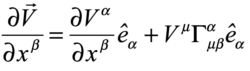 where the second term is just like the extra time-derivative term that showed up in the derivation of the Coriolis force.  The basis vector of a general coordinate system may change size and orientation as a function of position, so this derivative is not in general zero.  Because the derivative of a basis vector is so central to the ideas of GR, they are given their own symbol.  It is