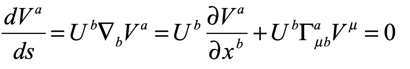 Everyone knows that a geodesic is the shortest path between two points, like a great circle route on the globe.  But it also turns out to be the straightest path, which can be derived using an idea known as “parallel transport”.  To start, consider transporting a vector along a curve in a flat metric.  The equation describing this process is