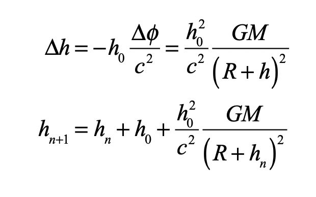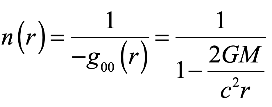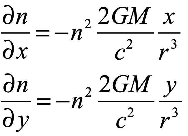 Einstein’s elevator is the classic test of virtually all heuristic questions related to the deflection of light by gravity.  In the previous Example, the deflection was attributed to the Equivalence Principal in which the observer in the elevator cannot discern whether they are in an acceleration rocket ship or standing stationary on Earth.  In that case, the time-like metric component is the sole cause of the free-fall of light in gravity.  In the Schwarzschild metric, on the other hand, the curvature of the field near a spherical gravitating body also contributes.  In this case, the geodesic equation, assuming that dr/dt = 0 for the incoming photon, is