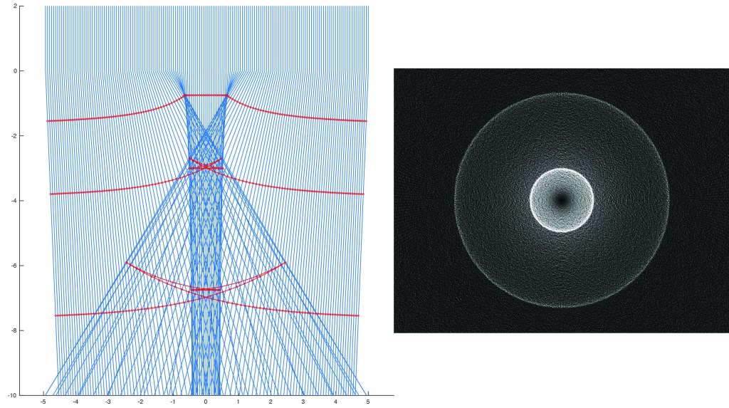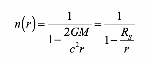 The Eikonal approximation does not strictly hold under strong gravity, but the Eikonal equations with the effective refractive index of space still yield semi-quantitative behavior. In the Python code, a correction factor is used to match the theory to the circular photon orbits, while still agreeing with trajectories far from the black hole. The results of the calculation are shown in Fig. 3. For large impact parameters, the rays are deflected through a finite angle. At a critical impact parameter, near 3 times the Schwarzschild radius, the ray loops around the black hole. For smaller impact parameters, the rays are captured by the black hole.