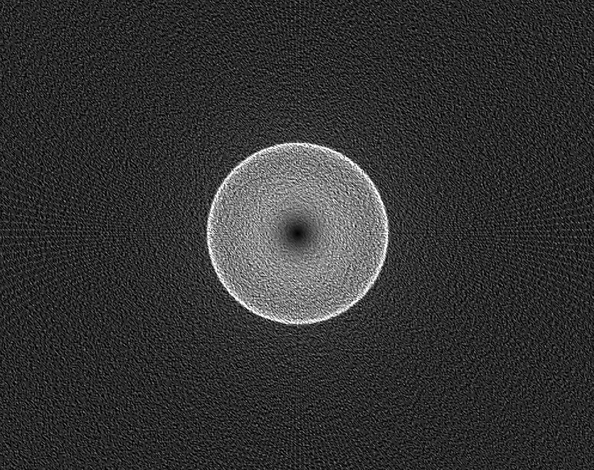 Fig. 3 Photon orbits near a black hole calculated using the Eikonal equation and the effective refractive index of warped space. One ray, near the critical impact parameter, loops around the black hole as predicted by von Laue. The central black circle is the black hole with a Schwarzschild radius of 10 units. The black ring is the circular photon orbit at a radius 1.5 times the Schwarzschild radius.