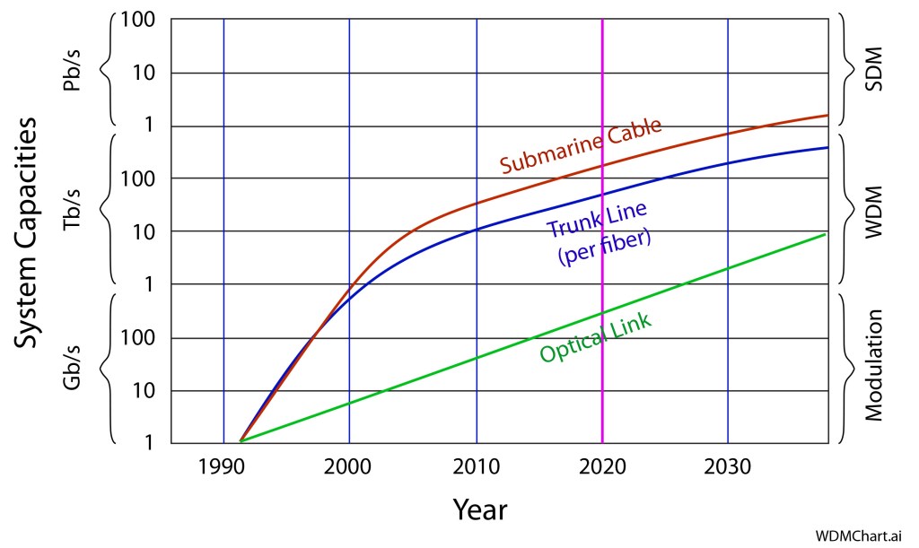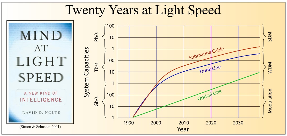 At the the turn of the Millennium we were seeing tremendous advances in data rates on fiber optics (see my previous Blog) as well as the development of new types of nonlinear optical devices and switches that served the role of rudimentary logic switches. At that time, it was not unreasonable to believe that the pace of progress would remain undiminished, and that by 2020 we would have all-optical computers and signal processors in which the same optical data on the communication fibers would be involved in the logic that told the data what to do and where to go—all without the wasteful and slow conversion to electronics and back again into photons—the infamous OEO conversion.