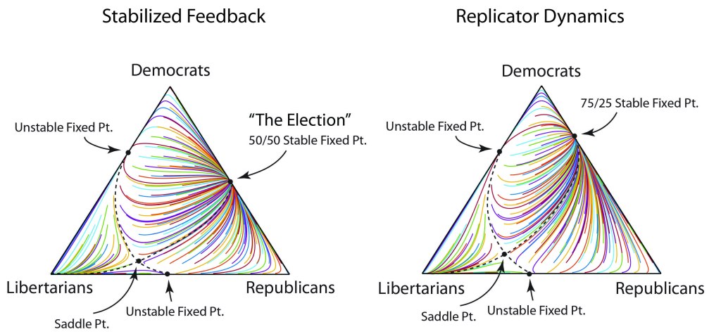 The population dynamics on the 2D simplex are shown in Fig. 8 for several different pay-off matrices (square matrix to the upper left of each simplex). The matrix values are shown in color and help interpret the trajectories. For instance the simplex on the upper-right shows a fixed point center. This reflects the antisymmetric character of the pay-off matrix around the diagonal. The stable spiral on the lower-left has a nearly asymmetric pay-off matrix, but with unequal off-diagonal magnitudes. The other two cases show central saddle points with stable fixed points on the boundary. A large variety of behaviors are possible for this very simple system. The Python program can be found in Trirep.py.