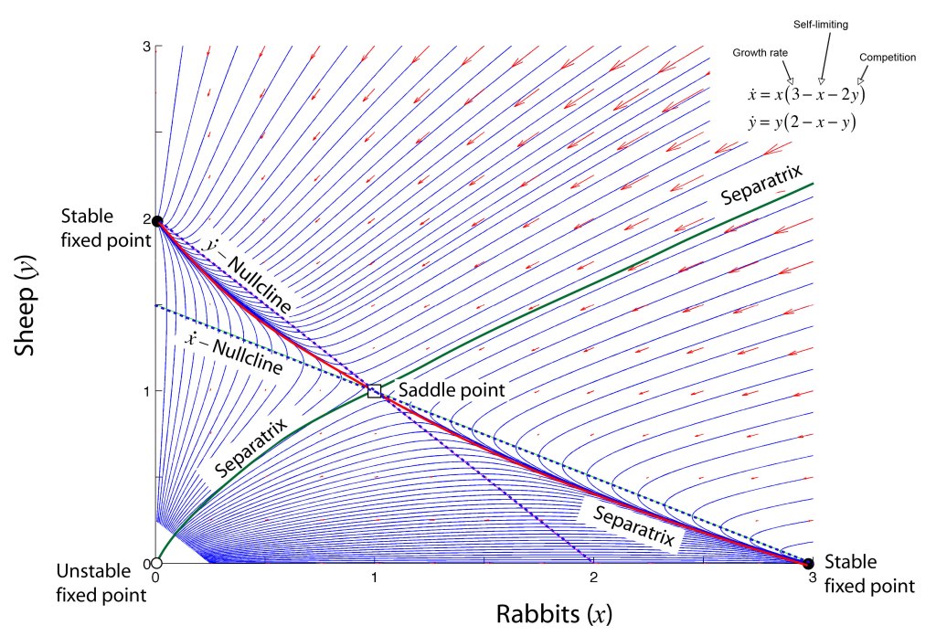 A classic model of interacting species is the replicator equation. It allows for a fitness-based proliferation and for trade-offs among the individual species. The replicator dynamics equations are shown in Fig. 7.