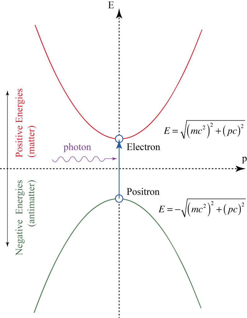 Fig. 3 An electron-positron pair is created by the absorption of a photon (gamma ray). Positrons have negative energy and can be viewed as a hole in a sea of filled electron states. (Momentum conservation is satisfied if a near-by heavy particle takes up the recoil momentum.)