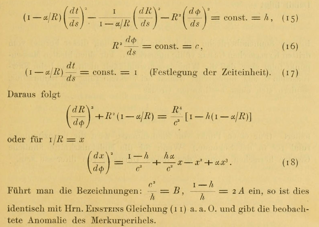 In the same paper, Schwarzschild used his exact solution to find the exact equation that described the precession of the perihelion of Mercury that Einstein had only calculated approximately. The dynamical equations for Mercury are shown in Fig. 8.