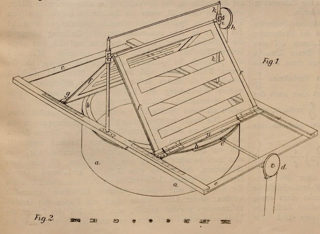 Schwarzschild enlisted the help of a fine German instrument maker to create a multiple slit system that had an adjustable slit separation. The device is shown in Fig. 3 from Schwarzschild’s 1896 publication on the use of the stellar interferometer to measure the separation of binary stars [7]. The device is ingenious. By rotating the chain around the gear on the right-hand side of the apparatus, the two metal plates with four slits could be raised or lowered, cause the projection onto the objective plane to have variable slit spacings. In the operation of the telescope, the changing height of the slits does not matter, because they are near a conjugate optical plane (the entrance pupil) of the optical system. Using this adjustable multiple slit system, Schwarzschild (and two colleagues he enlisted) made multiple observations of well-known binary star systems, and they calculated the star separations. Several of their published results are shown in Fig. 4.