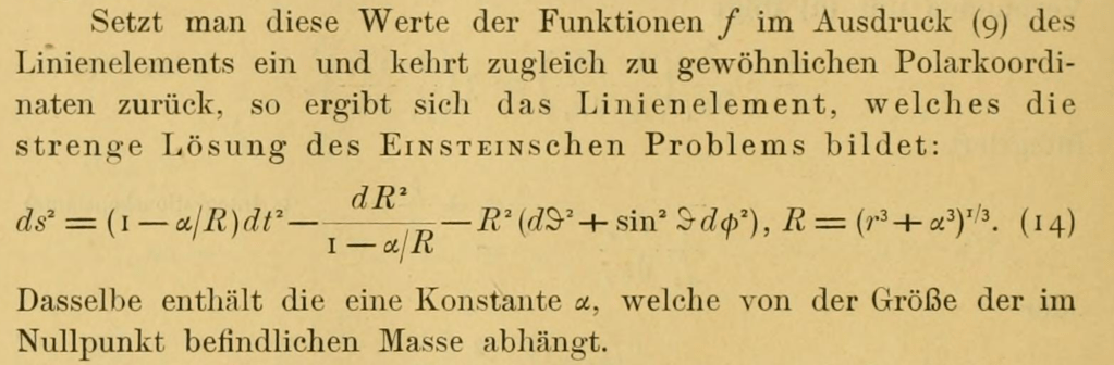 Schwarzschild’s solution to Einstein’s Field Equation of General Relativity was not a general solution, even for a point mass. He had constants of integration that could have arbitrary values, such as the characteristic length scale that Schwarzschild called “alpha”. It was David Hilbert who later expanded upon Schwarzschild’s work, giving the general solution and naming the characteristic length scale (where the metric diverges) after Schwarzschild. This is where the phrase “Schwarzschild Radius” got its name, and it stuck. In fact it stuck so well that Schwarzschild’s radius has now eclipsed much of the rest of Schwarzschild’s considerable accomplishments.