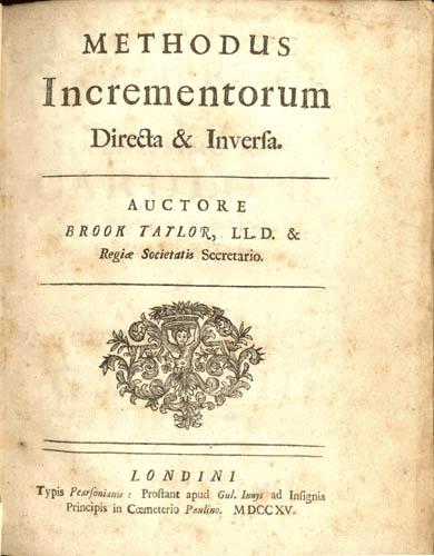 Once Taylor was introduced to Newton’s fluxions, he latched on and helped push its development. The same year (1715) that he published a book on linear perspective for art, he also published a ground-breaking book on the use of the calculus to solve practical problems. This book, Methodus incrementorum directa et inversa, introduced several new ideas, including finite difference methods (which are used routinely today in numerical simulations of differential equations). It also considered possible solutions to the equation for a vibrating string for the first time.